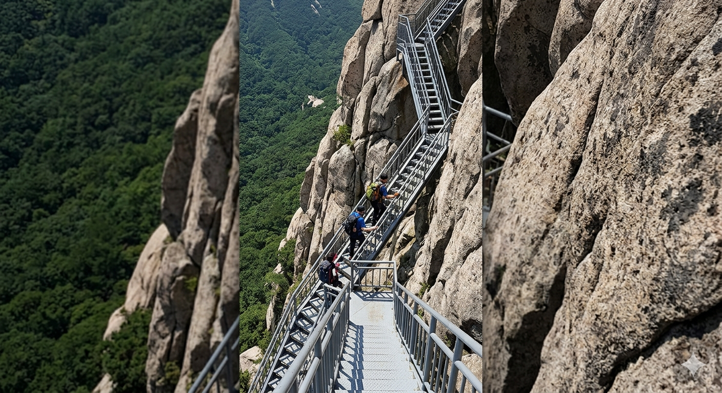흔들바위를 뒤로하고 본격적인 울산바위 본체로 진입하면, 지금까지의 평탄한 길은 사라지고 끝없이 이어지는 철제 계단과 가파른 암릉 구간이 등산객을 맞이합니다. 이른바 '808 계단'이라 불리는 이 구간은 체력적인 소모가 상당합니다.